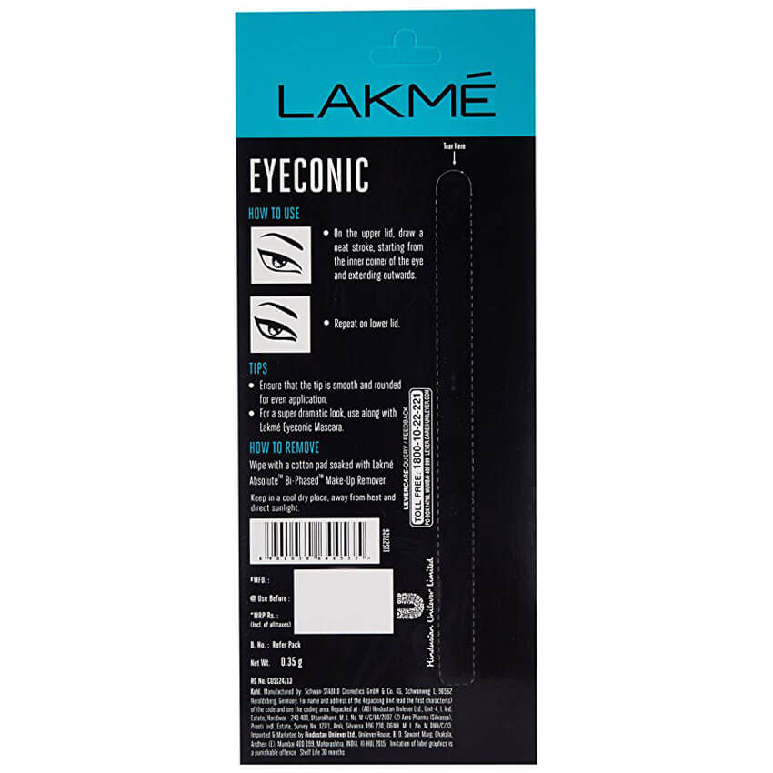 Accentuate the beauty of your eyes with the Lakme Eyeconic Kajal. This dermatologically tested kajal is just what you need for completing your eye makeup or carrying a simple, only-kajal look. It's a smudge proof, water proof kajal and can add the dramatic and glamorous look to your eyes. It has intense matte texture for Eyeconic eyes. You can Experiment with a thin line or a bold wing, this kajal is great for day and night looks. Its long-lasting- up to 22 hours without smudging and is completely water proof. It is designed with an easy to use and convenient twist-up format. Just one stroke of the Lakme Eyeconic Kajal enhances your simple look to a more stylish avatar. Its beat all your timelines, be it meetings, travelling or just a day out and lasts fr 22 hrs. You are incomplete without kajal and this is a perfect everyday product! Get the Lakme Eyeconic Kajal in black, now. The balck Eyeconic goes best with your Eyeconic mascara. To enhance your eyes further. You can also use from our 4 eye quartet pallets to enhance your eye to wedding a wedding, party and work look. Draw a neat stroke on the upper lid, starting from the inner corner of the eyes, extending outwards. Repeat on the lower lid.