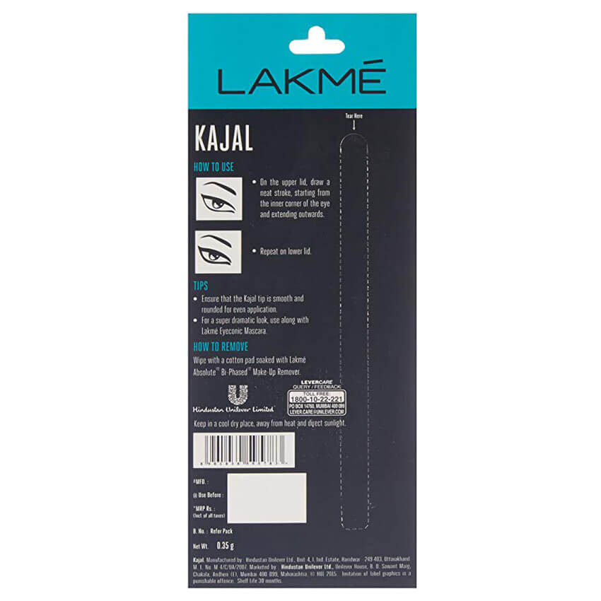 Accentuate the beauty of your eyes with the Lakme Eyeconic Kajal. This dermatologically tested kajal is just what you need for completing your eye makeup or carrying a simple, only-kajal look. It's a smudge proof, water proof kajal and can add the dramatic and glamorous look to your eyes. It has intense matte texture for Eyeconic eyes. You can Experiment with a thin line or a bold wing, this kajal is great for day and night looks. Its long-lasting- up to 22 hours without smudging and is completely water proof. It is designed with an easy to use and convenient twist-up format. Just one stroke of the Lakme Eyeconic Kajal enhances your simple look to a more stylish avatar. Its beat all your timelines, be it meetings, travelling or just a day out and lasts fr 22 hrs. You are incomplete without kajal and this is a perfect everyday product! Get the Lakme Eyeconic Kajal in black, now. The balck Eyeconic goes best with your Eyeconic mascara. To enhance your eyes further. You can also use from our 4 eye quartet pallets to enhance your eye to wedding a wedding, party and work look. Draw a neat stroke on the upper lid, starting from the inner corner of the eyes, extending outwards. Repeat on the lower lid.