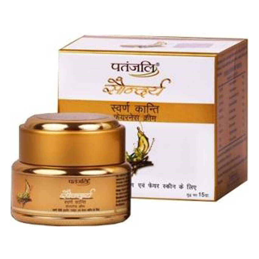 Patanjali Saundarya Swarn Kanti Fairness Cream : An advanced blend of purified gold with natural oils, herbs, vitamins & fruit extracts. Provides visible fairness, even skin tone; reducing blemishes and dark skin. Useful in nourishing, moisturizing & glorifying natural complexion.